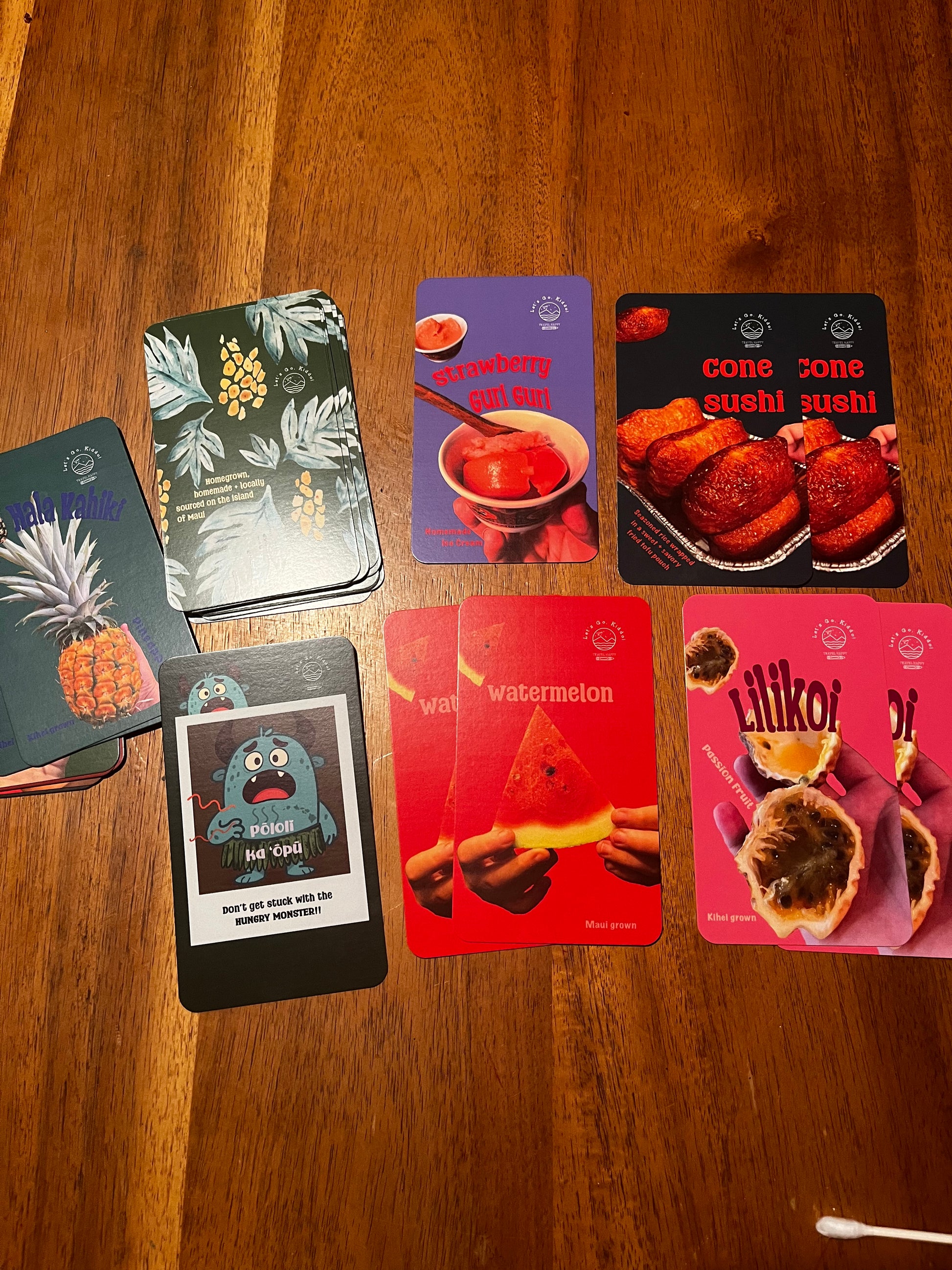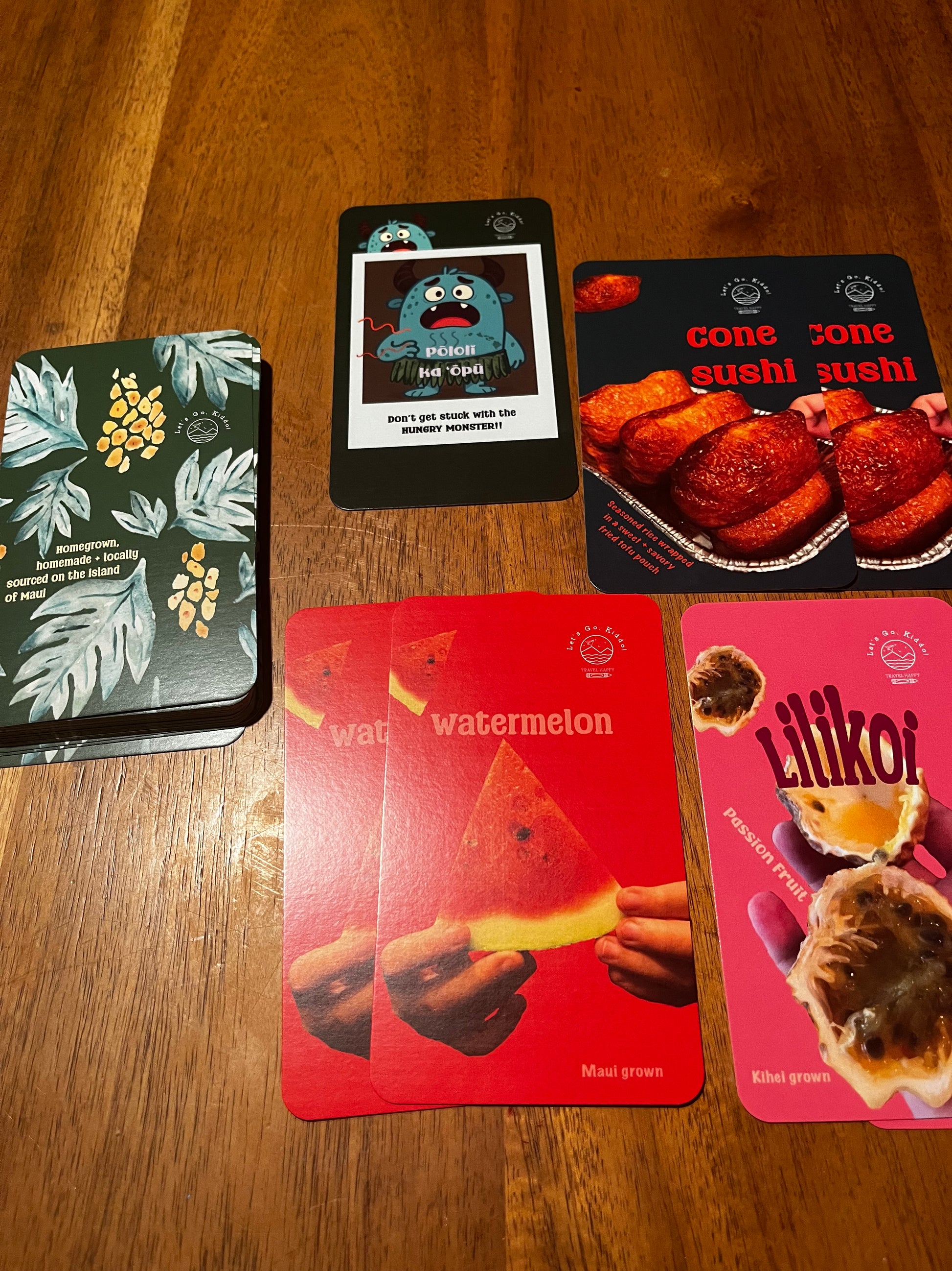 Our take on the classic card game- Old Maid! This version includes lots of local treats and produce that have made their way into our hands via our school garden, friends backyards, and our home kitchen. The goal is to collect the most pairs possible, all while avoiding getting stuck with Pōloli Ka ‘Ōpū (HUNGRY OPU)